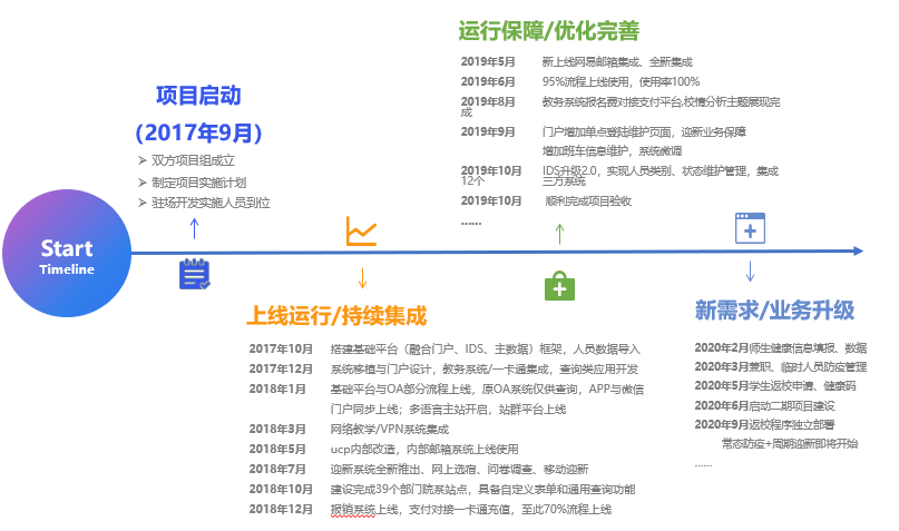 学校于2017年9月正式启动“智慧校园”一期项目,从顶层设计出发,建立智慧校园平台,以现有信息化建设现状为基础,保护和继承相关建设成果的同时,立足为师生打造一网通办服务。摒弃以往“拿来主义”理念,从实际场景出发,将“实用主义”作为信息化建设之路的风向标。