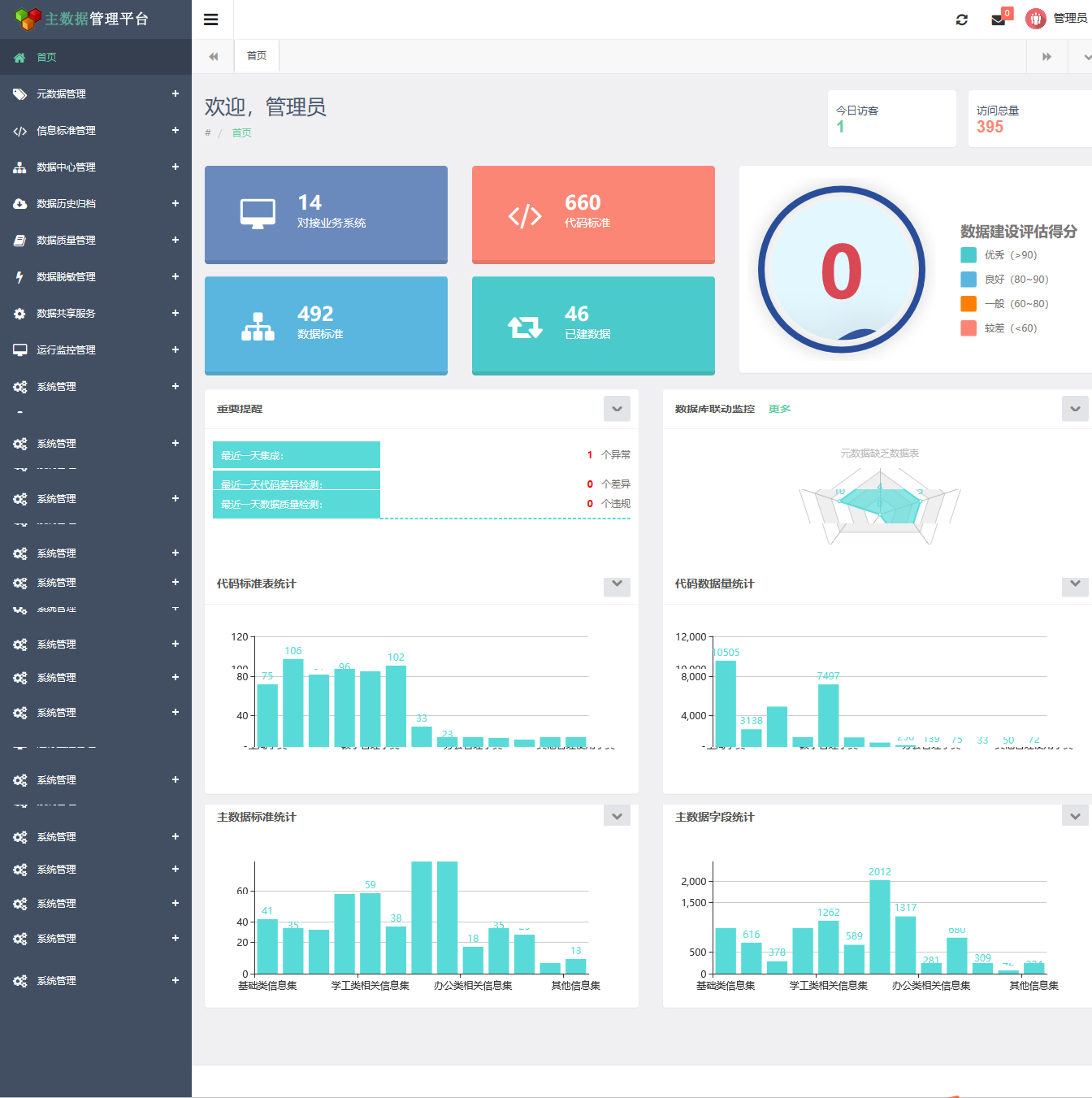 数据中心提供3种主题、多个维度的数据统计分析——校情总览、教工数据和学生数据;