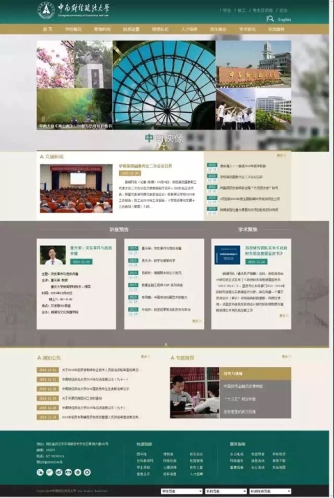 为中南财经政法大学设计时,考虑学校“人文社科类”学术氛围,结合学校极具地域特色的校园文化和秀丽文艺的建筑特色,取孔雀绿为主色调,土黄色为辅色调,营造一个清新浪漫的主页风格。