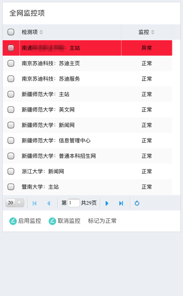 该系统主要执行网站可用性监控,对设定的网站域名或IP地址进行7*24小时互联网可用性检测,及时发现网站无法访问、主站与新闻网被篡改等问题,并向苏迪运维团队及时预警。