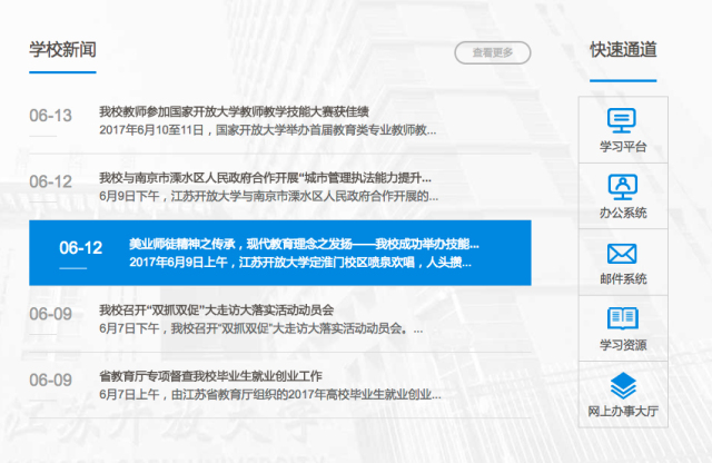 在学校新闻旁为访问者提供最常用的系统访问通道。在为用户提供最新最快资讯的同时,让用户能快速链接至所需要的学习或办公系统。