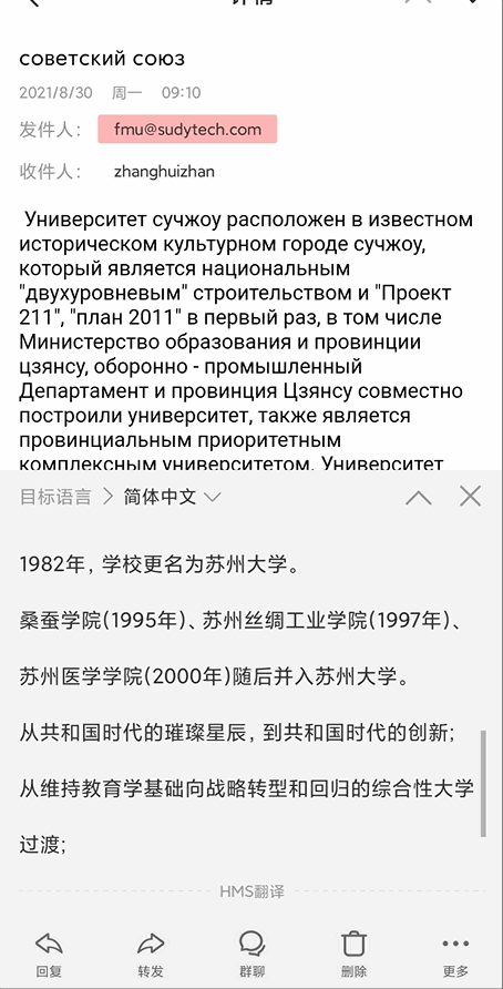 “云中苏大APP”的邮件系统提供十几个语种智能翻译!不仅可以翻译邮件的正文,而且还可以翻译附件,让跨国沟通不再是问题~