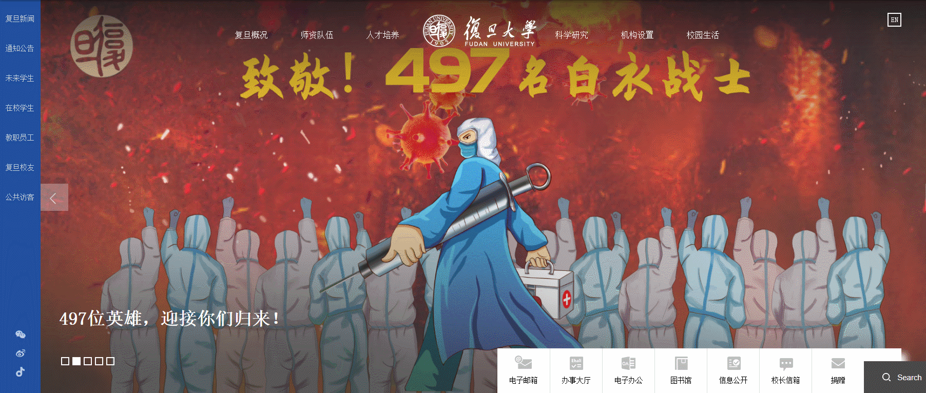 复旦大学此次更新上线的中文主页,无论是设计风格还是内容设置,大到页面全局,小至“细枝末节”都是可圈可点,暗藏着别具一格的“小心思”。