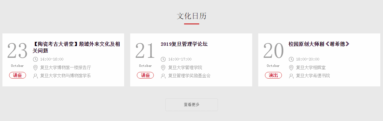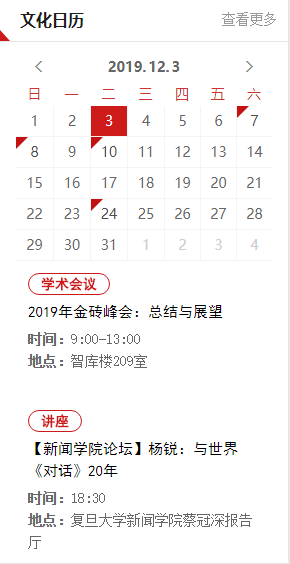 该板块以日历的形式进行活动预告,点击后展示详情信息,并且数据与学校官网主页联动,实现多处呈现的效果,扩大活动的宣传范围。