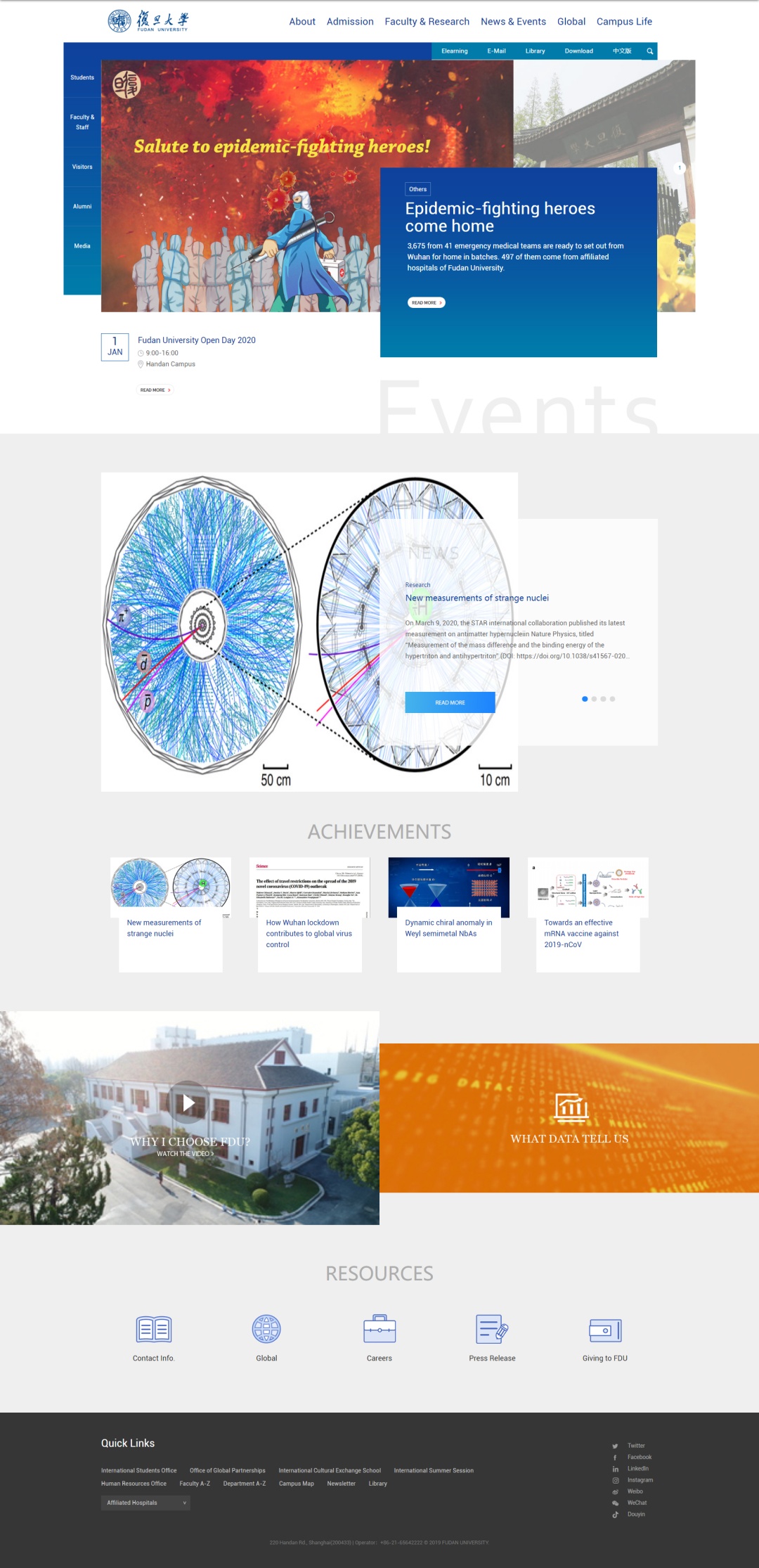 较之复旦中文官网,英文版主页新增了学术科研成就以及择校理由等模块,着重突出学校的科研实力,加强海外招生的宣传力度和影响力。