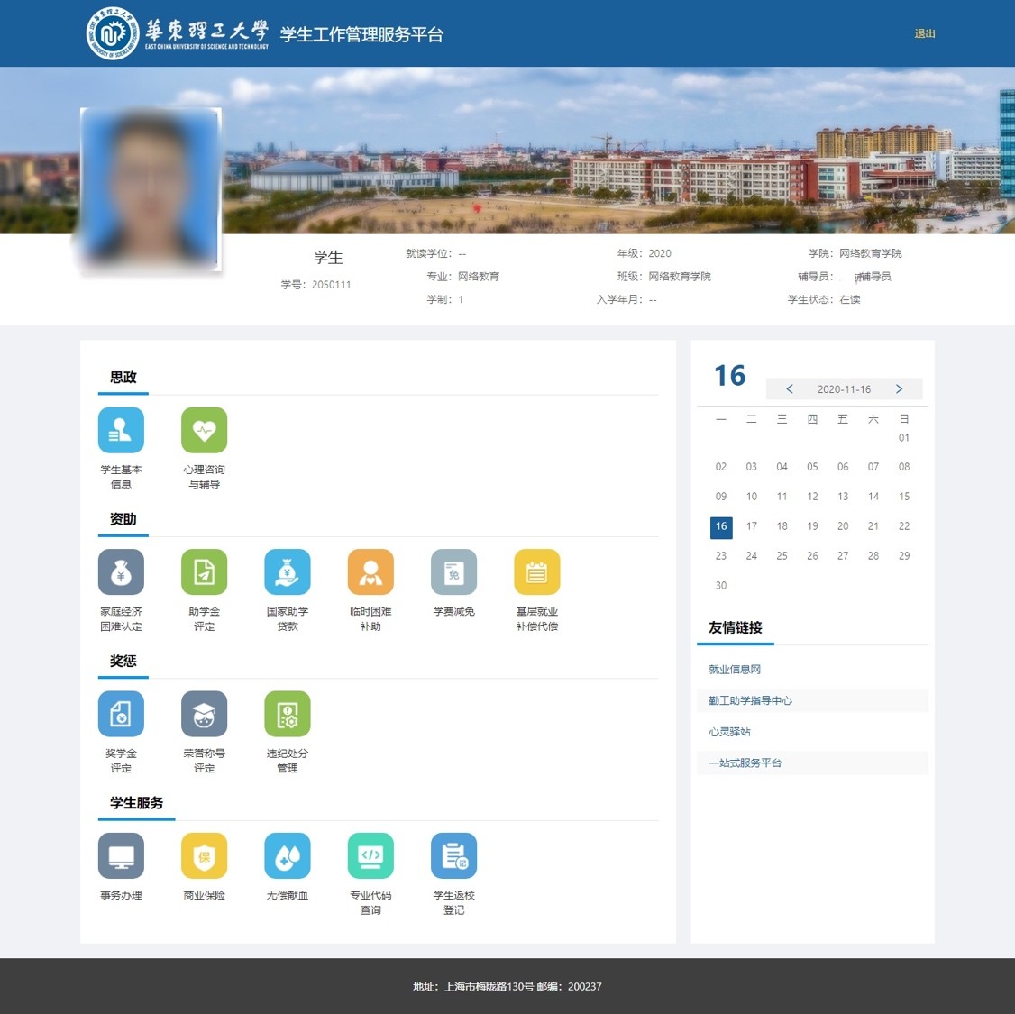 对学生个人而言,可以查看到与自己有关的服务内容,从查看个人的基本信息、学籍信息、住宿信息,到参与资助有关的困难生认定、学费减免、助学金…...学生只需关注自身的需求,都可以在平台上找到最佳的服务。