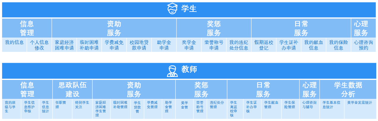 在日常的管理过程中,学生、辅导员、班主任、学院领导,不同身份的用户所参与的活动有很大不同。在梳理出服务需求的基础上,系统按照不同用户角色来分析业务、剖析流程,为用户提供最优的服务体验。
