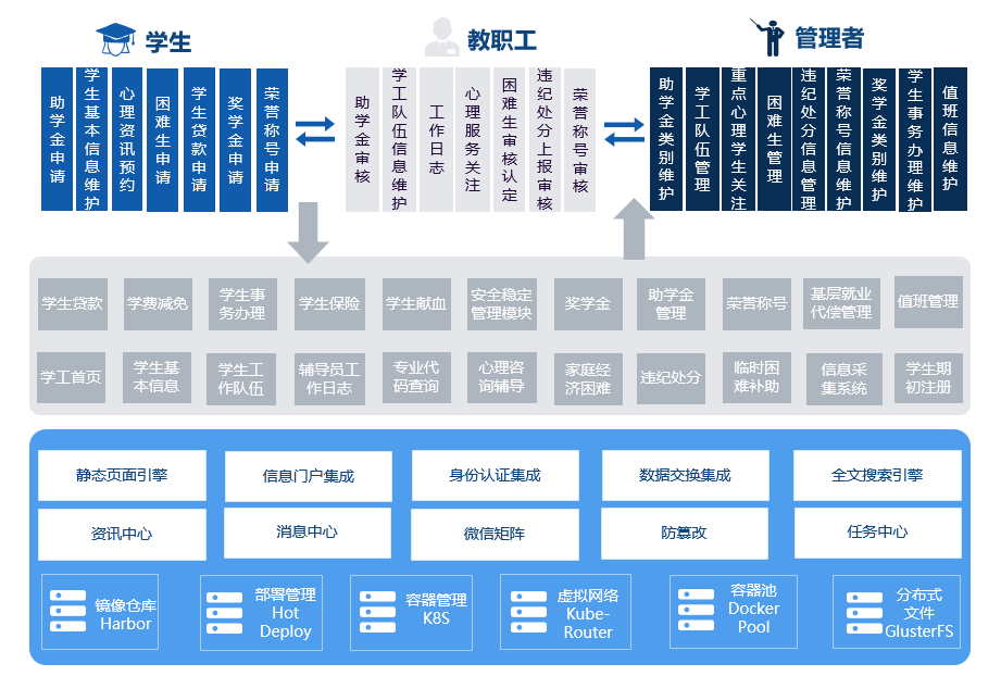 学生工作管理服务平台,属于融合服务的一部分,与一网通办可分可合、相辅相成,采用相同的架构体系、共同合理利用中台服务。