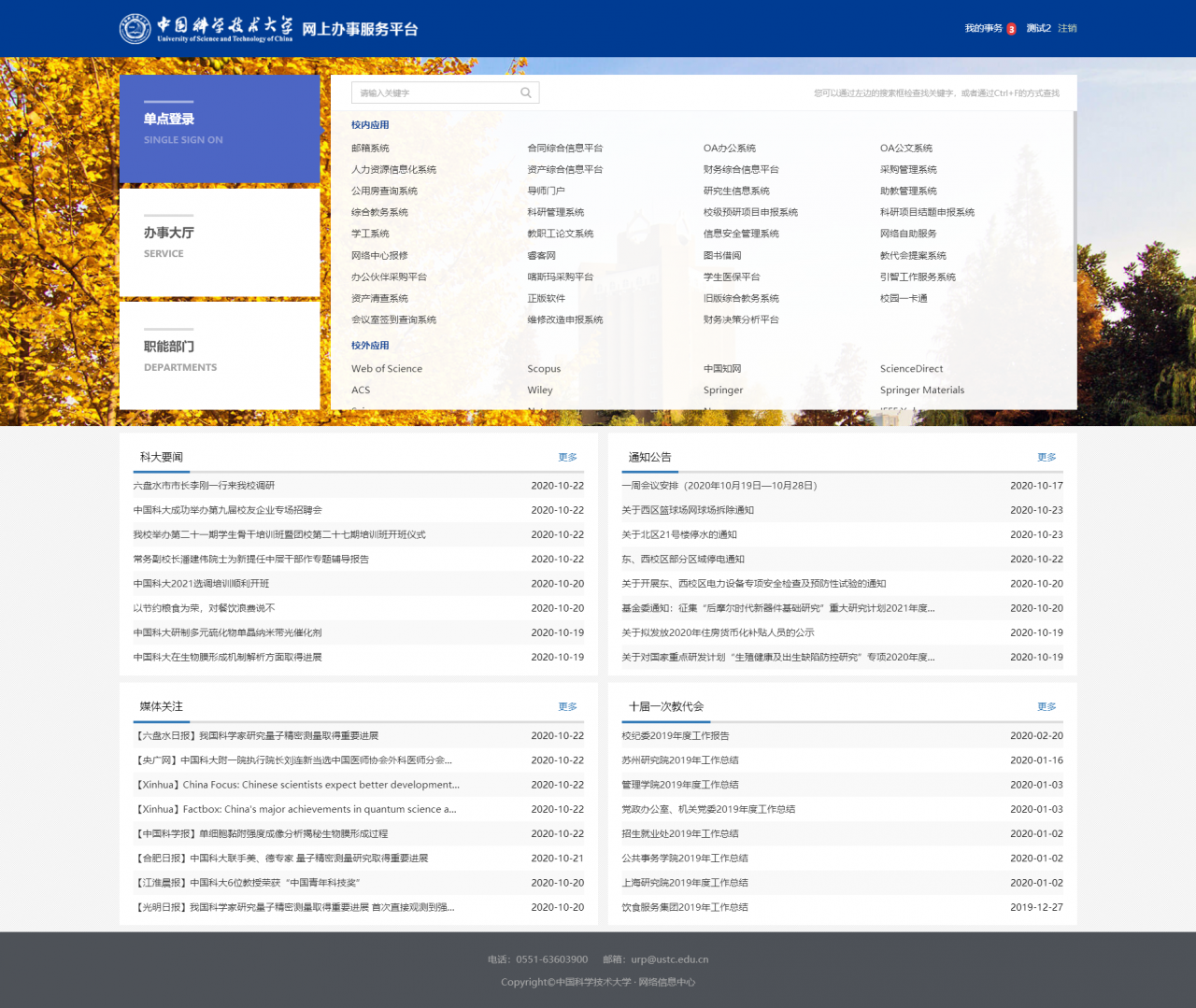中科大一站式办事大厅目前已经成为学校信息化访问入口和高地,其以便捷用户为导向,简洁明了,极简高效,充分考虑各种系统、数据、服务、流程的融合,诠释着另一种“一网通办”的建设宗旨与师生服务内涵。