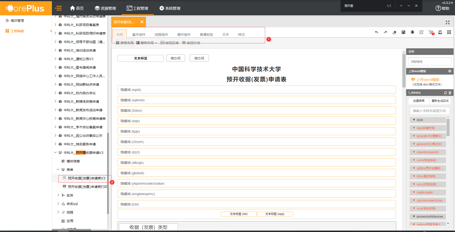 以预开收据(发票)申请表为例,通过上图中的导航栏,可以快速进行业务表单的拖拽式开发工作。